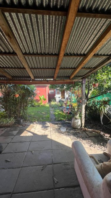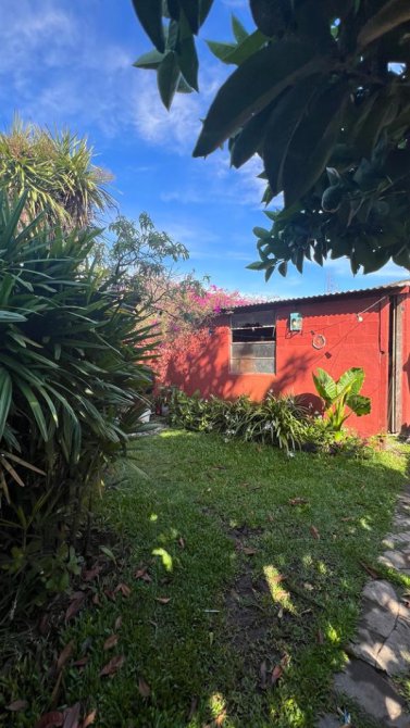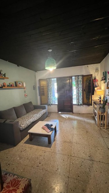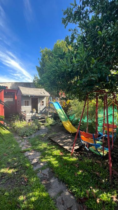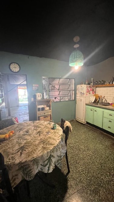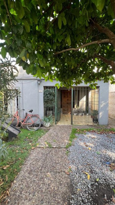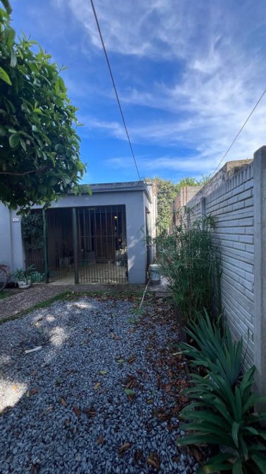 Casa de tres ambientes con jardín al frente, reja perimetral, living, comedor, cocina totalmente instalada, dos dormitorios con placar, baño completo con bañera y amplio fondo libre con un cuarto de enseres en el fondo.