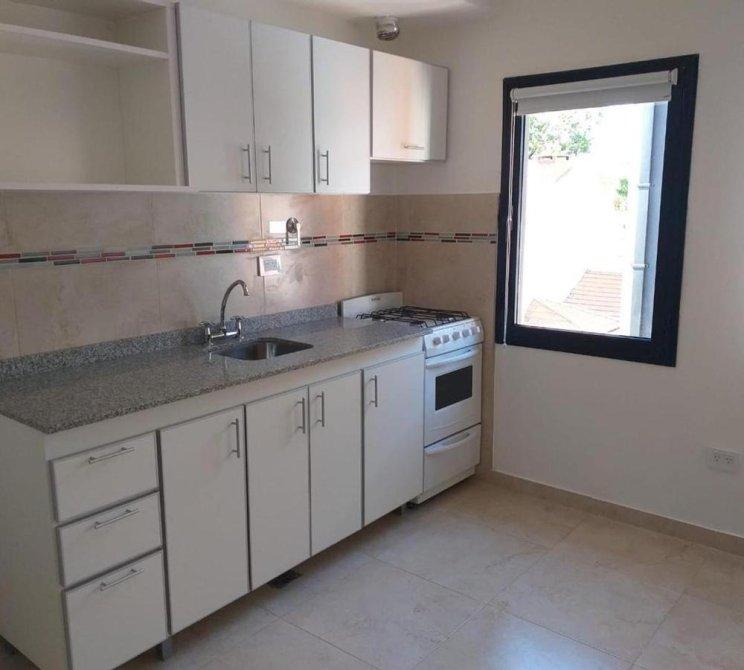 Cocina equipada con muebles de bajo y alto mesada de carpintería completa, anafe eléctrico y horno a gas.