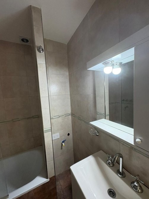 Baño completo, espacio para lavarropas de carga superior, vanitory con botiquín y espejo y bañera con mampara de vidrio
