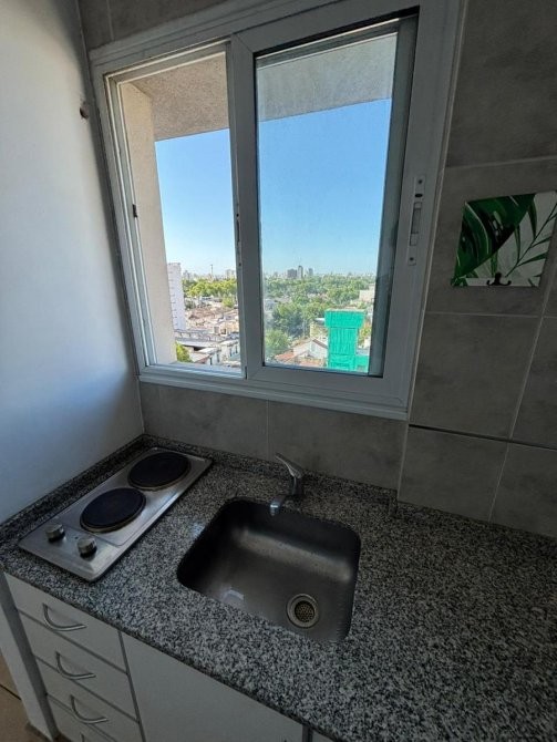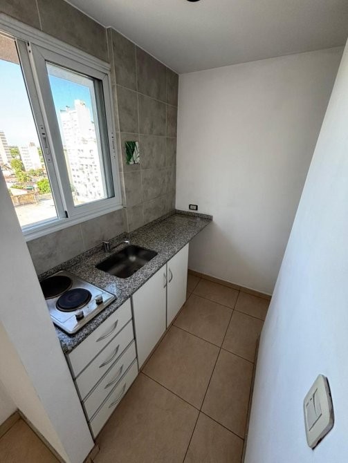 Cocina con muebles bajos, anafe electrico de dos hornallas, termotanque electrico y conexion para lavarropas.