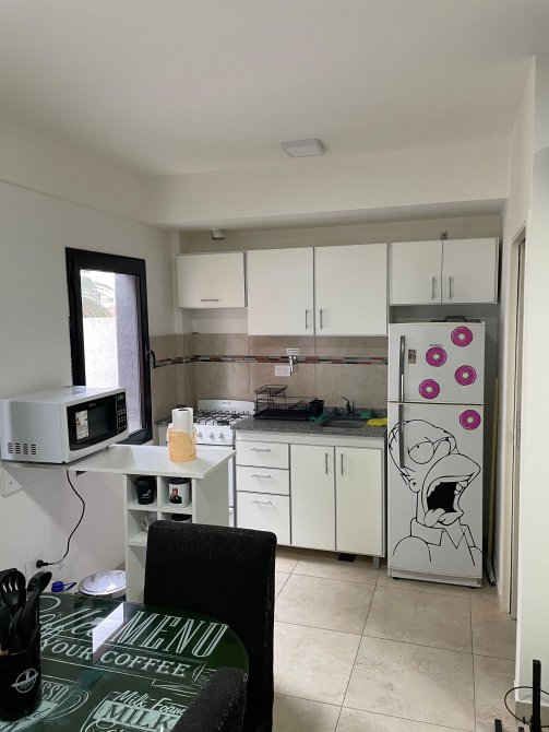 Cocina equipada: carpintería completa con muebles bajo y alto mesada, cocina a gas. Con horno y parrila.