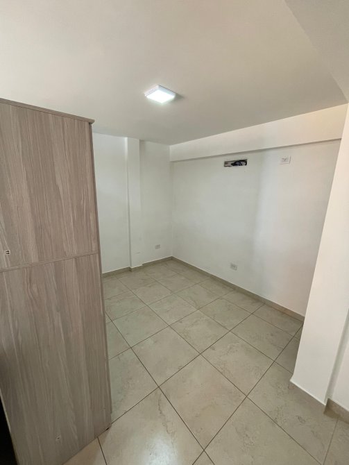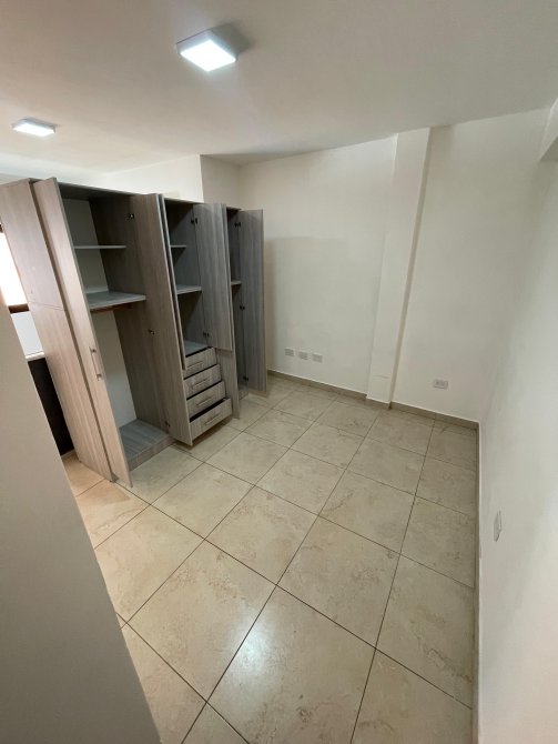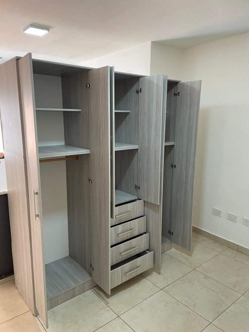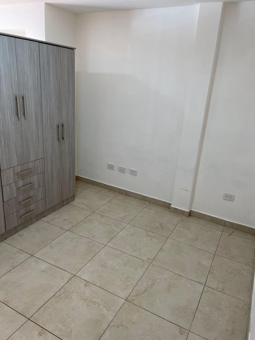 La zona destinada al descanso es luminosa y cuenta con suficiente espacio para una cama de tamaño estándar, permitiendo la creación de un entorno confortable y bien iluminado. El baño es completo, con ducha, inodoro y lavamanos, diseñado para garantizar comodidad y eficiencia en un espacio compacto.