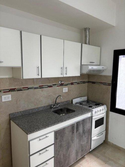 Cocina equipada con muebles de bajo y alto mesada de carpintería completa, anafe y horno a gas.