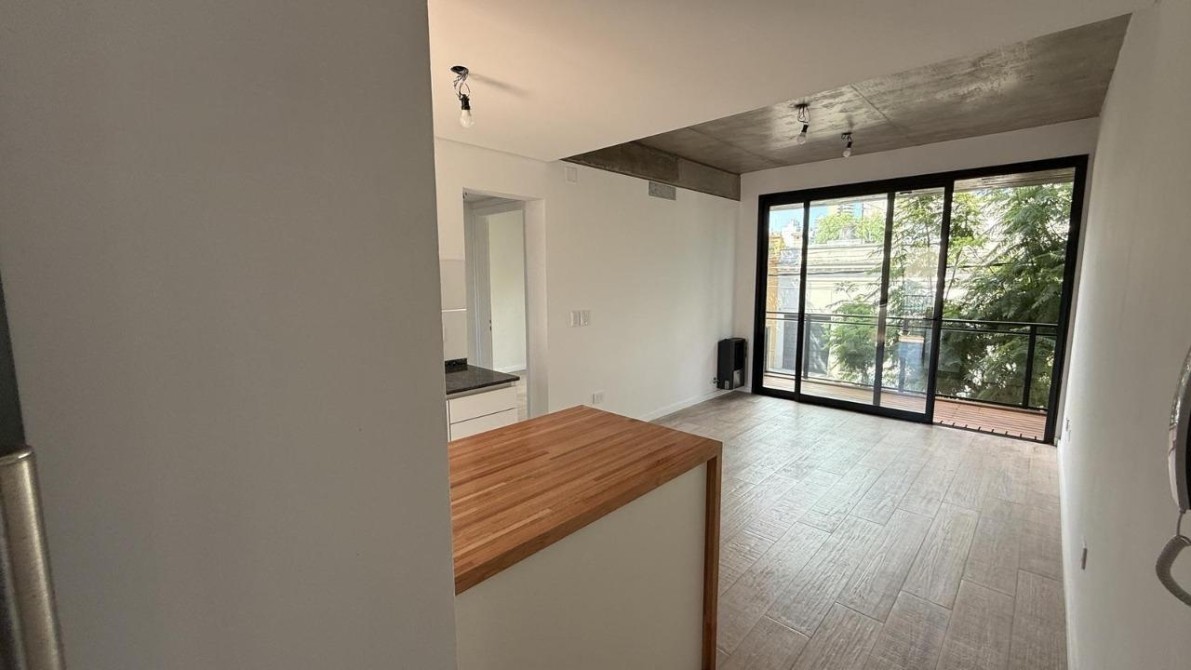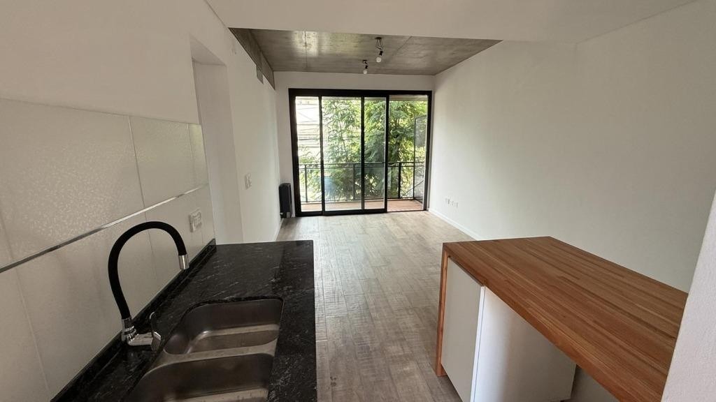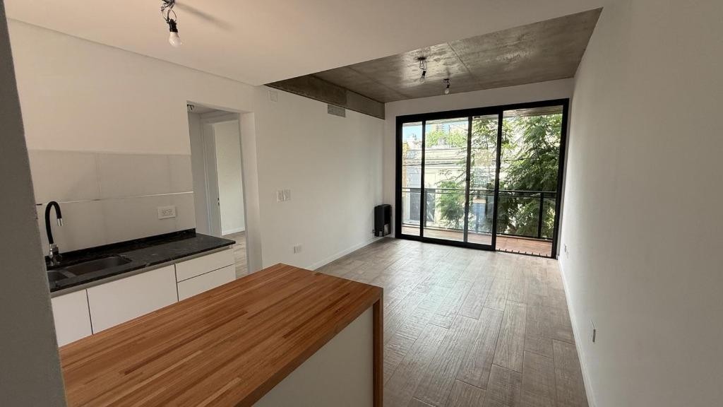 cocina integrada con barra, conexión para lavarropas, muebles alto y bajo mesada, salida a balcón interno.