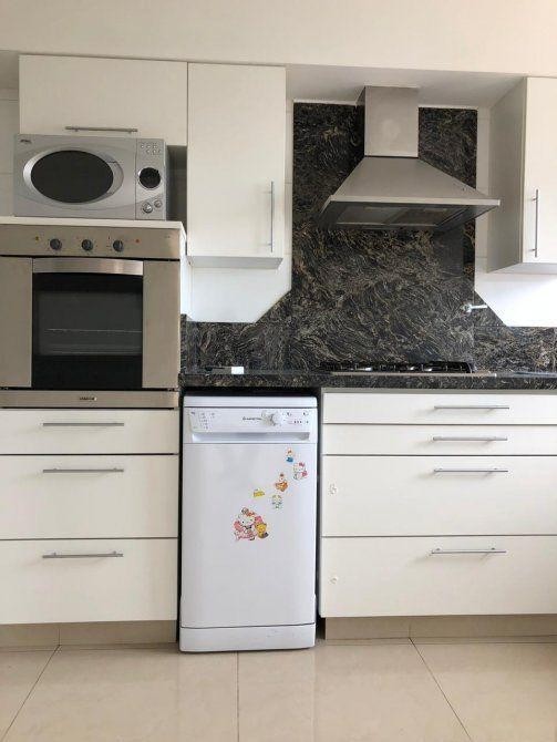 cocina equipada, con muebles altos y bajo mesada, horno empotrado, y extractor de aire.