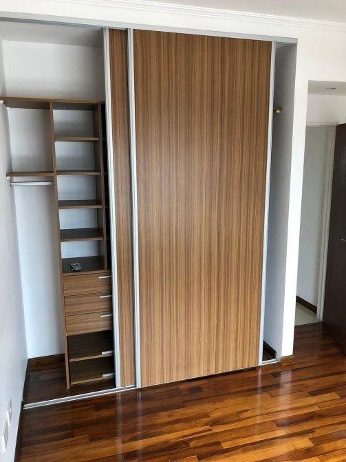 Dormitorio principal con baño en suite, aire acondicionado, y placard empotrado con sus interiores.